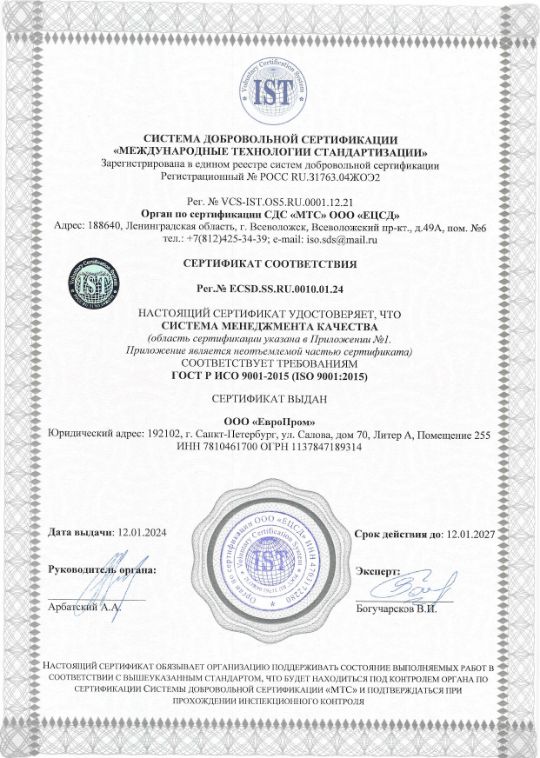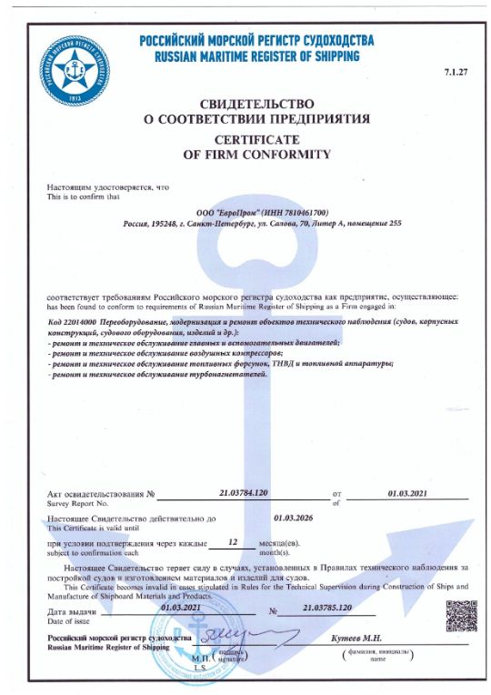 Наше производство сертифицировано согласно требованиям стандартов качества международных квалификационных сообществ Морской и Речной регистр, имеем сертификаты, ISO:9001 и РСТ.